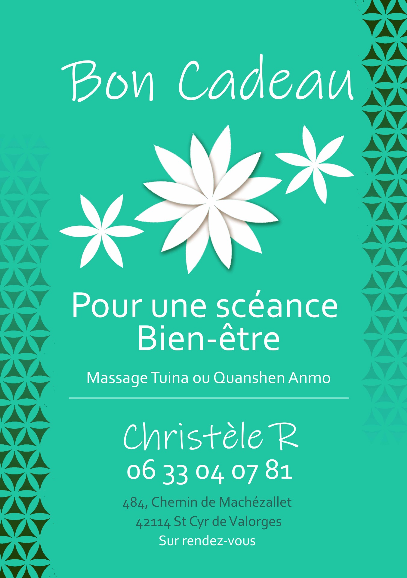 Grâce aux soins que m'a apporté Christèle, c'est l'esprit léger que j'avance. En effet, elle a su me libérer de fardeaux gardés depuis bien longtemps, me faire lâcher prise, trouver réponses à certaines questions. A l'écoute, bienveillante, délicate et bien d'autres qualités encore sont entre ses mains pour votre bien-être.